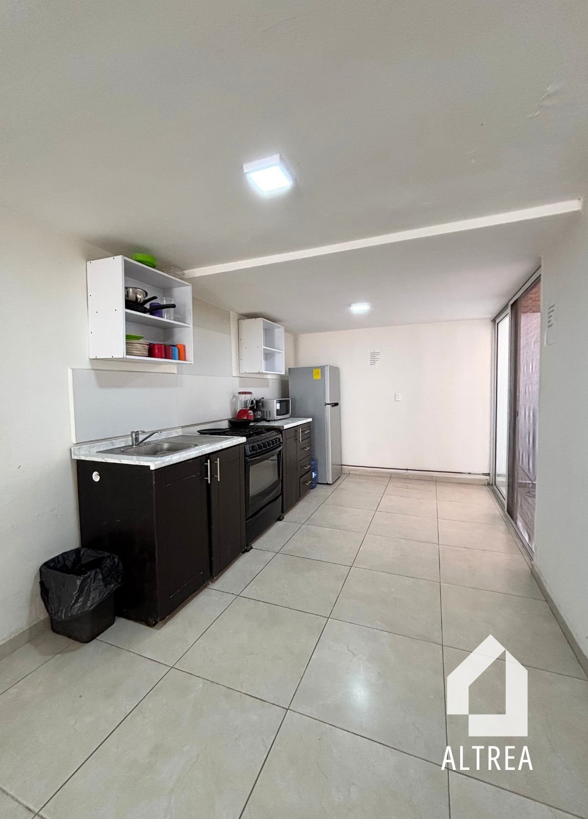 - Cocina equipada con estufa, campana y espacio de almacenamiento